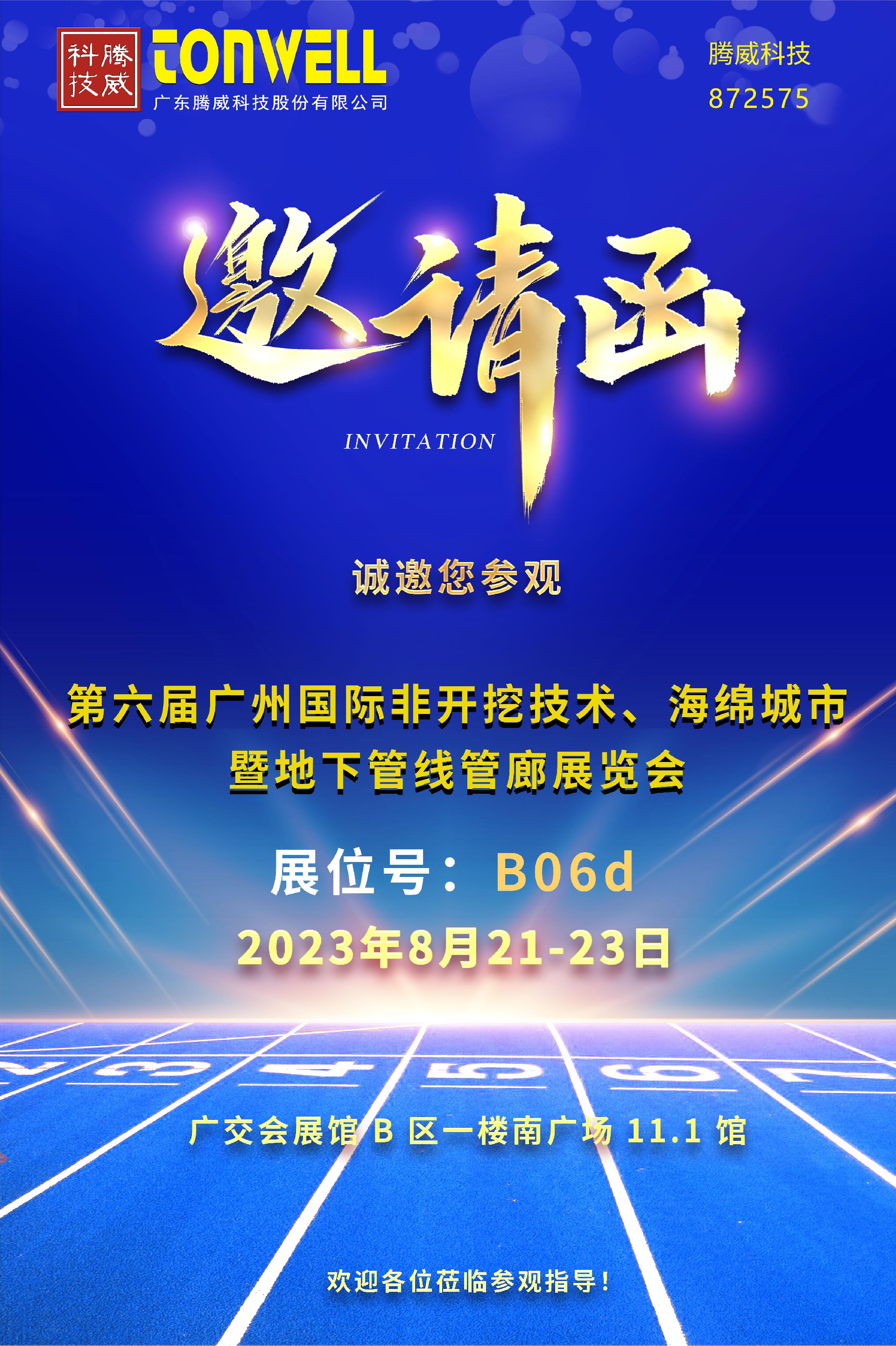 2023年8月21日-23日第六屆廣州國際非開挖技術、海綿城市暨地下管線管廊展覽會在廣州·廣交會展館B區舉辦廣東騰威科技股份有限公司誠邀各位合作伙伴及客戶蒞臨參觀、洽談合作!我們,廣州見!